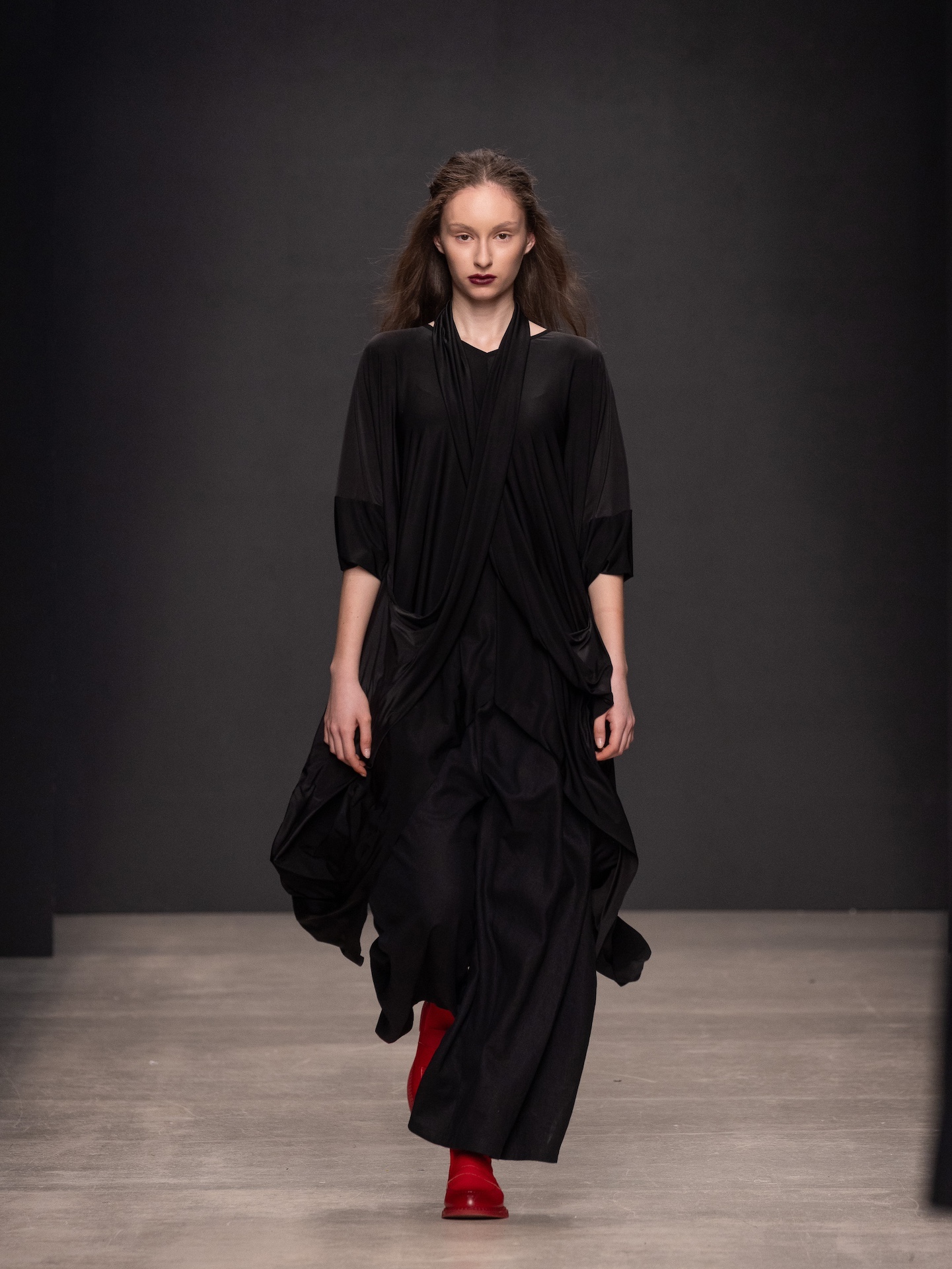 Тиснёные материалы, декоративные складки и акцентные рельефы делают силуэты живыми, но не перегруженными — вещи читаются многослойно, а не театрально. На подиуме дизайнер Лилия Киселенко доказывает, что грамотная деконструкция не разрушает привычный гардероб, а расширяет его: один и тот же жакет или платье легко вписывается и в дневной, и в вечерний сценарий.