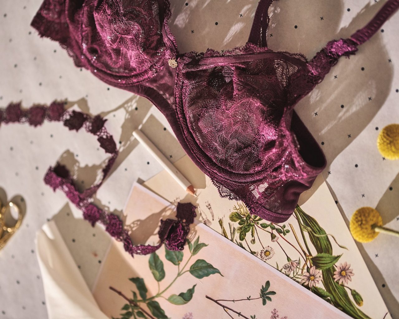 В отличие от пиона модель-азалию «одели» в жаккард, дополнив шедевр сетчатыми панелями и нежной вышивкой в виде цветов азалии. Бюстгальтер-минимайзер, изготовленный из формованного жаккарда, придает округлую форму груди, визуально не увеличивая ее, а напротив – уменьшая. Ламинированная ткань на чашках обеспечивает дополнительную поддержку. В комплекте с бюстгальтером креативный директор Сиан Томас предлагает носить элегантные, с тонкими сетчатыми вставками и цветками азалии трусы с высокой посадкой.